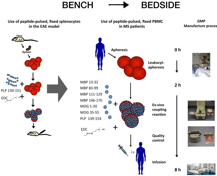 Background: In order to induce immune tolerance in MS patients, we adopted a very promising tolerization strategy that employs autologous peripheral blood mononuclear cells (PBMC) pulsed with myelin peptides and chemically fixed with the cross linker 1-ethyl-3-(3-dimethylaminopropyl)-carbodiimide (EDC) as tolerogenic vaccine. Over the last few years we developed a manufacture process for the ex vivo preparation of antigen-coupled cells and assessed the feasibility, safety and tolerability of a single infusion of peptide coupled PBMC in a first-in-man trial in patients with MS. Our main objective is to advance the treatment strategy further, using antigen-coupled red blood cells (RBCs) as tolerogenic vaccine and to assess its safety, efficacy and mechanisms of action in a phase I/IIa trial in MS patients.